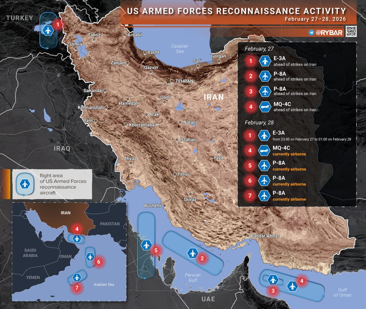 ➡️On February 26 and 27, at least 4 aircraft and drones were detected near Iranian borders. Over the Persian Gulf, a P-8A aircraft operated in the direction of Bushehr, Assaluyeh and Bandar Abbas, which came under attack.