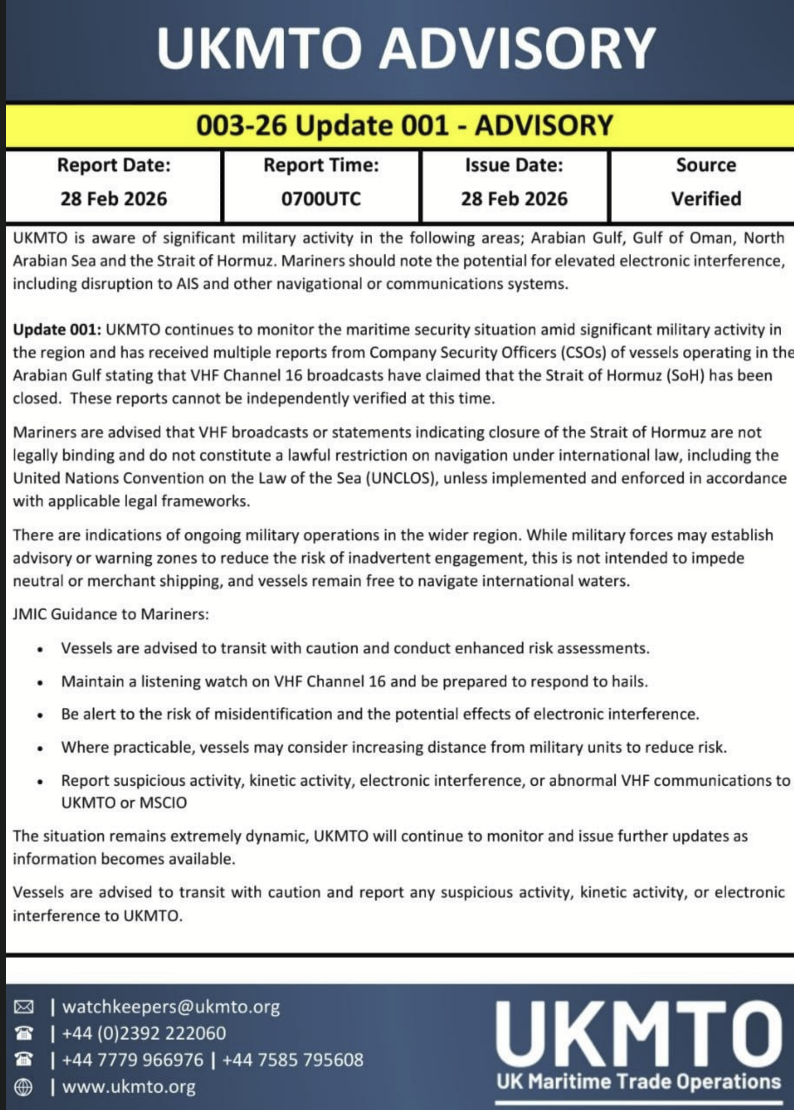 🇺🇸⚔️🇮🇷 UKMTO Advisory 03/26 Update 01 warns mariners of heightened maritime security risks in the Middle East as of February 28, 2026.
