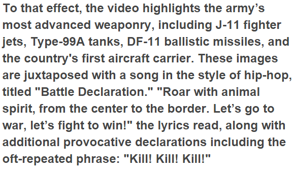 “There are always missions in soldiers’ minds, enemies in their eyes, responsibilities on their shoulders, and passions in their hearts,” the video’s voiceover says, opening on an image of young PLA soldier in uniform. “There could be a war at any time. Are you ready for that?”