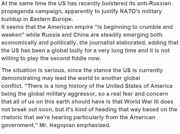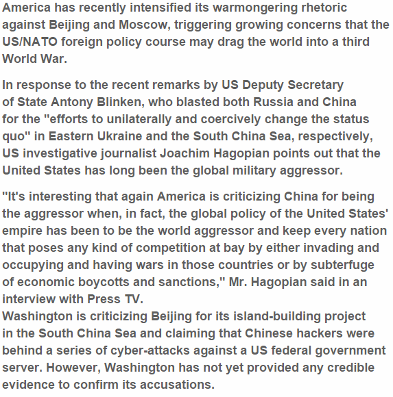 The US’ blatant warmongering rhetoric and actions against Russia and China may lead to a new world war, a US investigative journalist underscored, dubbing Washington a “global bully.”