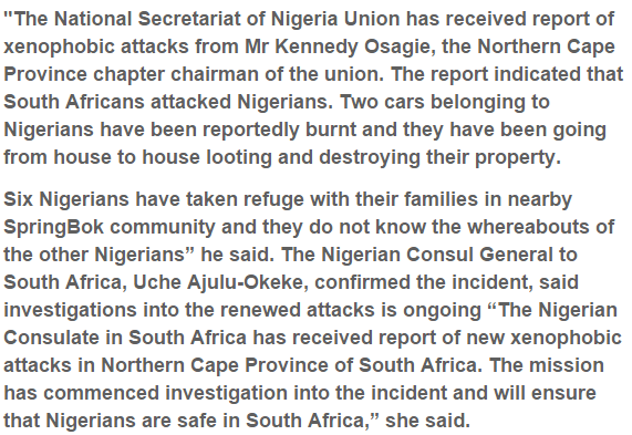 The President of the Nigerian Union in South Africa, Ikechukwu Anyene has raised alert over new instances of xenophobic assaults launched by South Africans against Nigerians and other remote nationals dwelling in Sternkopf, Namakwa Municipality, Northern Cape Province of South Africa. Anyene said two autos belonging to Nigerians were smoldered while their homes plundered in restored assaults.