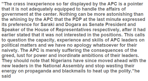 The Publicity Secretary of PDP, Olisa Metuh says the development of Senator Bukola Saraki and Hon. Yakubu Dogara as the new leaders of the National Assembly which is against their party wishes, implies that APC is not all well prepared to handle the undertakings of government at the center. In the announcement he released today June 10th, Mr Metuh said the APC is just suffering from the greed, desire for power and extreme aspirations of the party’s leaders.