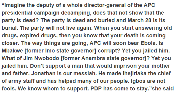 Talking at the PDP ladies rally in Onitsha, Anambra state today March 23rd, First Lady Patience Jonathan said APC will be burial on March 28th.