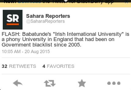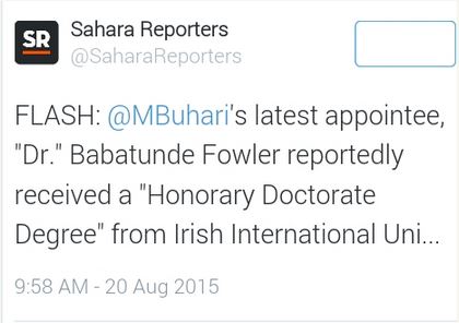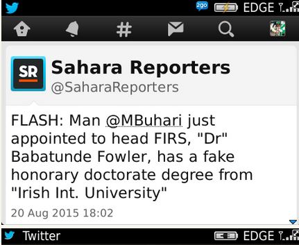 News reaching Sahara Reporter has it that the recently delegated head of FIRS, Babatunde Fowler has a fake honorary doctorate degree from Irish international University.