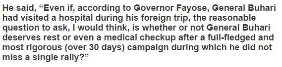 Fayose additionally asserted that the late trek of the previous Head of State was to empower him get medicinal consideration, in opposition to the position of the APC that he was in United Kingdom on a working visit.