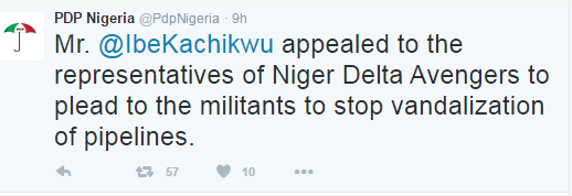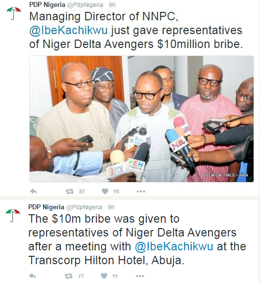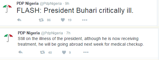 In a series of tweets,PDP uncovered that President Buhari is basically sick and set to be flown out of the country. He is currently receiving treatment in Nigeria. PDP likewise accused NNPC representatives Ibe Kachikwu delegates for bribing Niger Delta avengers fighters with $10m. The sum was given to them after a meeting held at Transcorp Hilton Hotel, Abuja.