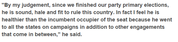 Representative Rabiu Kwankwaso of Kano state says to the best of his insight as a chieftain of the APC, his party’s presidential hopeful, Gen Muhammadu Buhari is sound and generous & considerably healthier than President Jonathan. Senator Kwankwaso said this while tending to newsmen in Kano yesterday February 22nd.