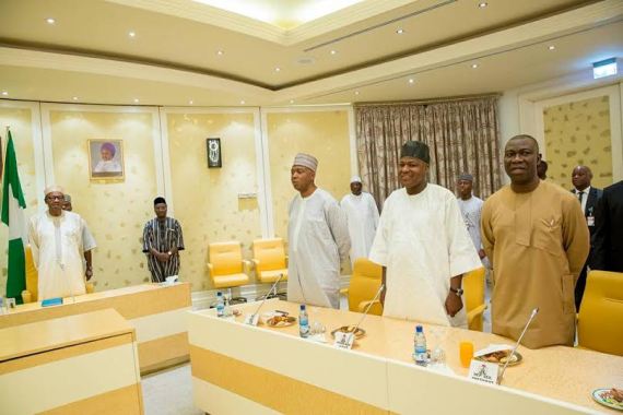 Pics: Buhari’s Body Language as he meets with Saraki, Dogara over 2016 budget
