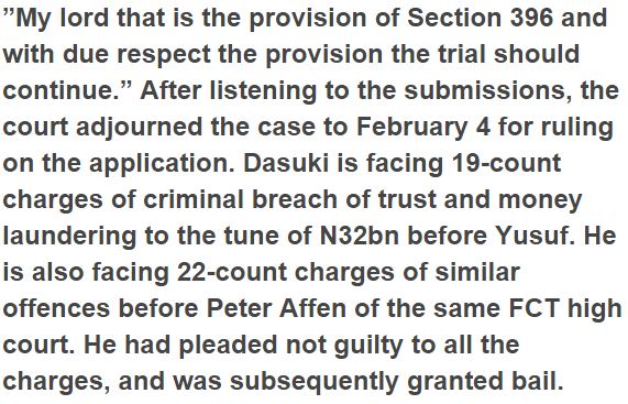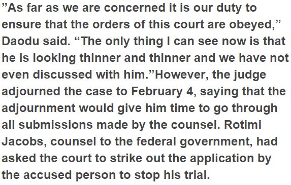 On Friday, Joseph Daodu, Dasuki’s legal advisor, said that he had neither seen his client nor met with him since he was taken into detainment by the DSS. He in this manner implored the court to stay proceedings for the situation until the federal government consented to its request.