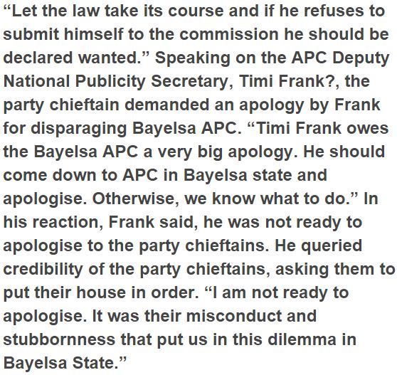•Demands expression of remorse from Timi Frank