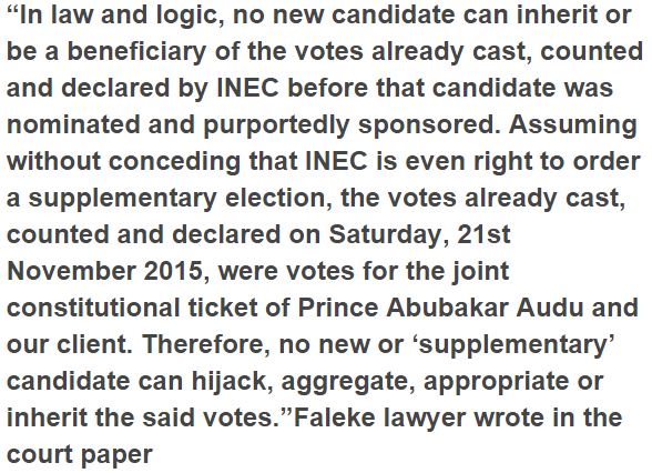 The deputy governorship hopeful of the All Progressives Congress in the November 21st race in Kogi State, James Faleke, today filed a suit at the Federal High Court, Abuja, against INEC over their decision to declare the November 21st decision uncertain. In the suit which was filed by his counsel, Wole Olanikpekun, Faleke solicited that they announce him victor from the decision. He scowled at the choice by his party, APC to field Yahaya Bello as Audu Abubakar’s substitute for the December fifth supplementary election ..
