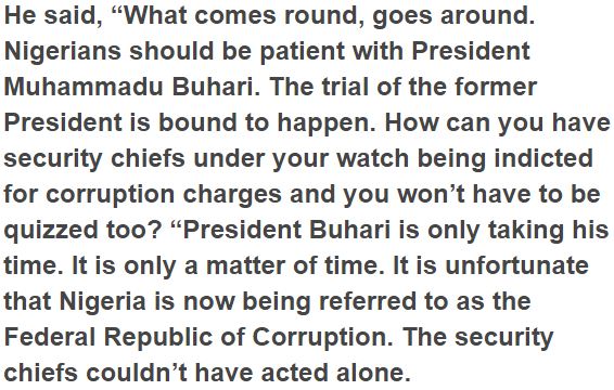 A Second Republic lawmaker, Pa Ayo Fasanmi, has said that the trial of previous President Goodluck Jonathan for corruption charges is a matter of time. The nonagenarian legislator, who talked with our journalist in a phone meeting, on Tuesday, be that as it may, said Nigerians should not be in a rush to see the trial of Jonathan begin.