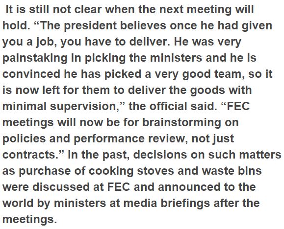 The federal executive council (FEC) meeting, which used to hold week by week since 1999, will now happen once in two weeks, OoduaRere can report. President Muhammadu Buhari has decided that meeting each Wednesday is surplus to requirement, a senior government authority told Ooduarere.