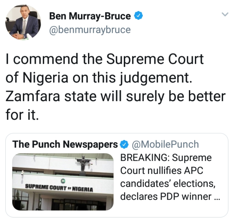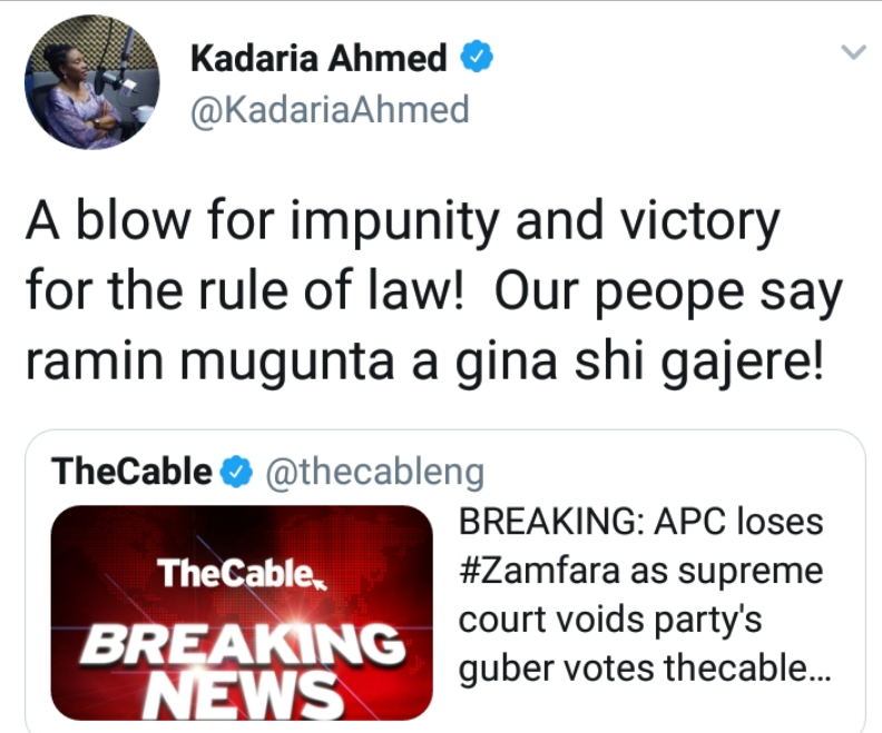 The Supreme Court in Zamfara nullifies APC’s Votes in Zamfara and declared parties with second highest votes winner that will be PDP, Dr Bello Muhammed. FFK, Shehu Sani, Ben Bruce, Kadaria Ahmed took for their twitter to respond to the News…