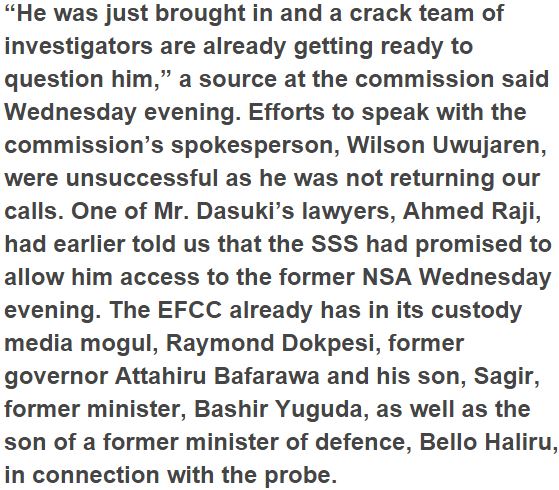 Previous National Security Adviser, Sambo Dasuki, who was captured on Tuesday by agents of the Department of State Security Service, has been transferred to the Economic and Financial Crimes Commission, EFCC. A source at the commission had before on Wednesday revealed that the commission asked for the exchange of Mr. Dasuki so he could be questioned by a group investigating how $2.2 billion meant for arms obtainment was diverted through his office for political purposes.