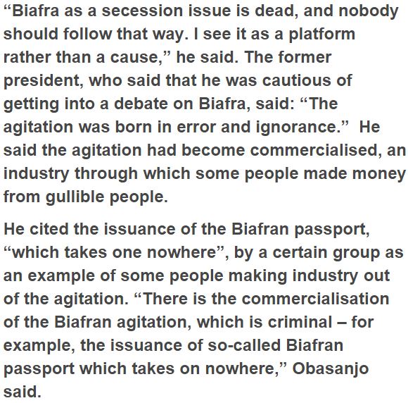 Previous President Olusegun Obasanjo has depicted the “Biafra secession issue” as dead, exhorting that no Nigerian should give vent to the fomentation. Obasanjo put forth the expression while conveying his keynote address at an open discussion on Biafra organised by Nextier Advisory in Abuja on Friday.