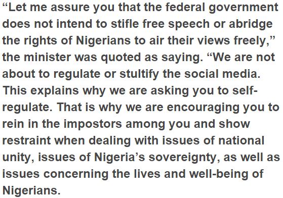 Lai Mohammed, minister of information and culture, says the administration of President Muhammadu Buhari won’t smother free speech by trying to regulate the online networking or abridging the rights of the citizens. As per Segun Adeyemi, the minister’s aide, Mohammed said this in Lagos on Monday amid a meeting with some online social media activists.
