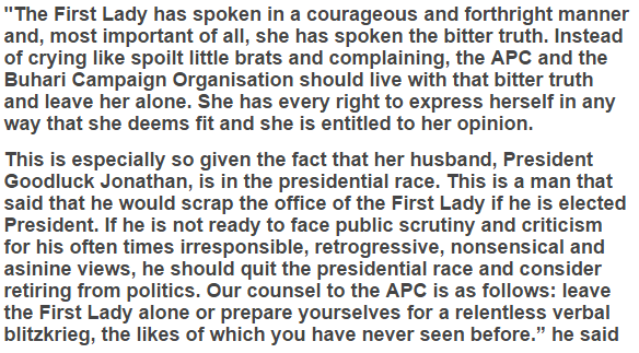 The representative of the PDP Presidential crusade association, Femi Fani-Kayode, has turned out to shield the late comments by first woman Patience Jonathan, that APC Presidential applicant, Gen Buhari is old and mind dead.