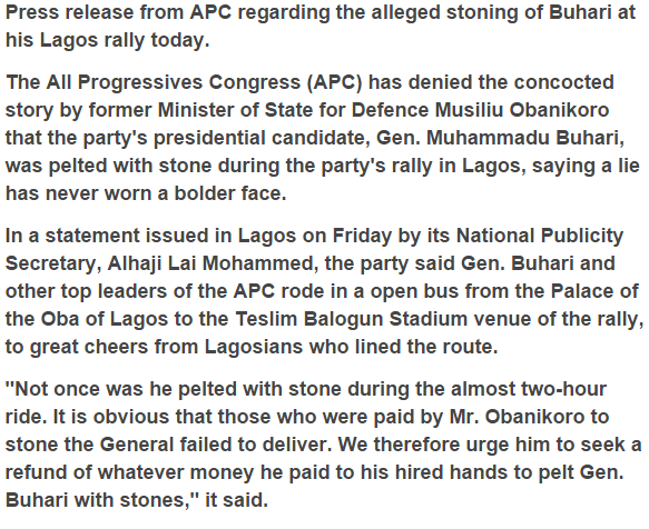 Home / News From Nigeria / Breaking News / Gen. Buhari was not stoned in Lagos – APC