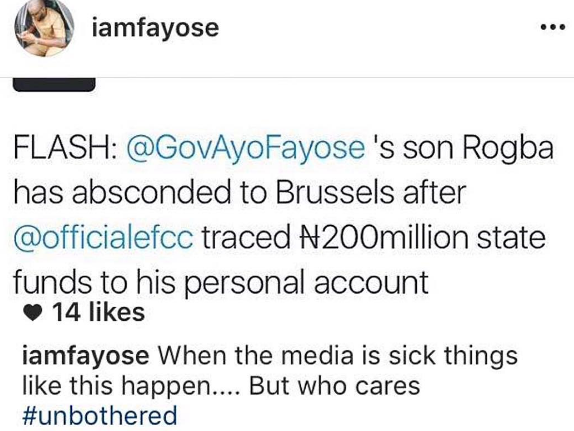 Gov. Fayose’s son, Funsho, reacts to media reports that his brother has taken to his heels.