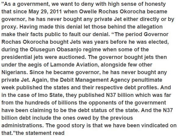 Imo state representative, Rochas Okorocha says in contrary to stories being sold by the opposition in his state, he’d purchased his private jet before becoming a governor, an evidence that he didn’t use the state’s money to purchase one. The governor said this after a few government officials in the state asked him to sell his private jet and use the generated avenue to address unpaid pay salaries of civil servants in the state. Okorocha’s response is contained in an announcement released by his Chief Press Secretary, Sam Onwuemeodo, today August 27th. See it bellow.