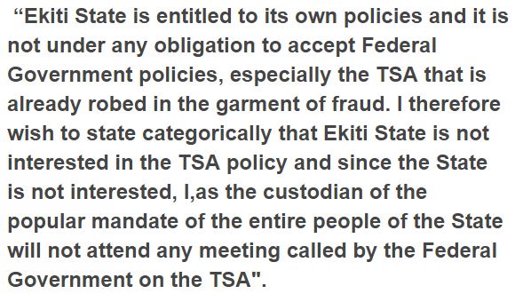 Is TSA a fraud? Pls fayose should answer me. Has centralising anything in life ever been a fraud,,,,,, To center all things of equal mean & value has not ever been a problem useless if Fayose want to testify to Nigerians that he is out of sense