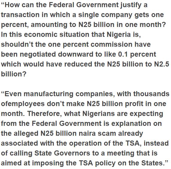 Is TSA a fraud? Pls fayose should answer me. Has centralising anything in life ever been a fraud,,,,,, To center all things of equal mean & value has not ever been a problem useless if Fayose want to testify to Nigerians that he is out of sense