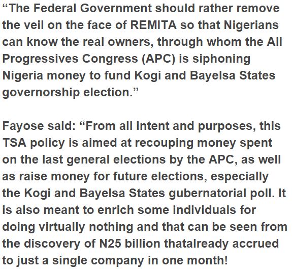 Claims policy is a fraud against Nigerians. Governor Ayodele Fayose of Ekiti State, has said he won’t go to the meeting called by the Federal Government with State governors on the Treasury Single Account (TSA), indicating out completely that the State Government was not keen on the TSA approach, which he said was a misrepresentation against Nigeria and its kin.