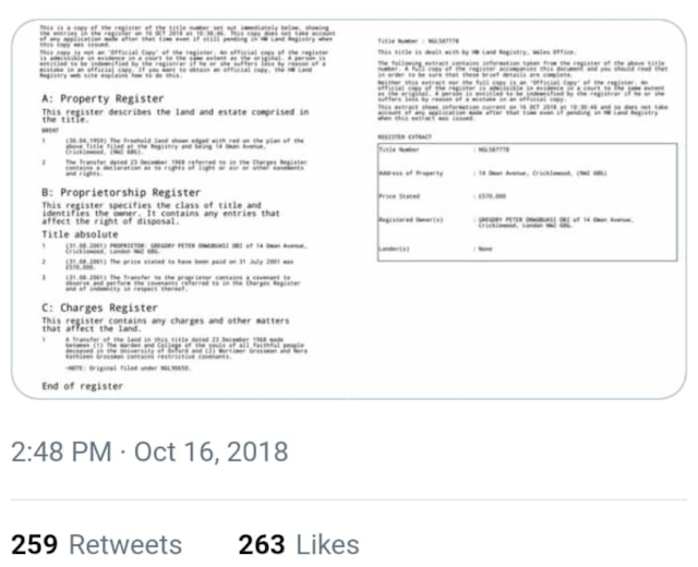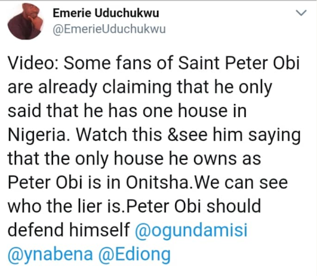 It all started when Yekini Nabena, APC Deputy National Publicity Secretary, tweeted a document alleging that Peter Obi is the owner of a mansion in London. The said document allege the property was acquired in 2001.