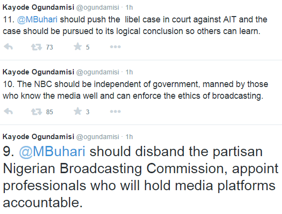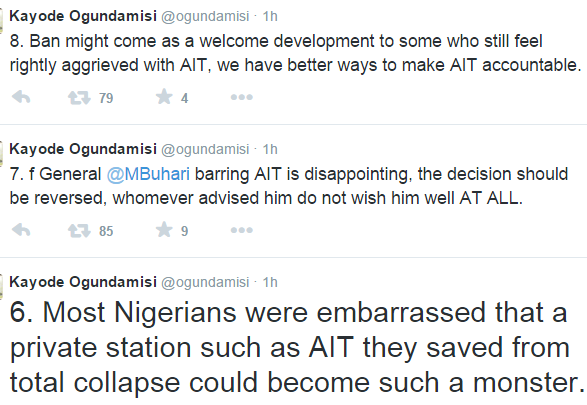 A staunch supporter of Gen Buhari, social and political analyst, Kayode Ogundamisi took to twitter toward the beginning of today to talk against the president-elect choice to ban AIT from covering his exercises. He censured AIT for the way they aimed to get Buhari amid the race and said they ought to be made responsible for what they did yet says banning them is not the best approach. See what he composed bellow.