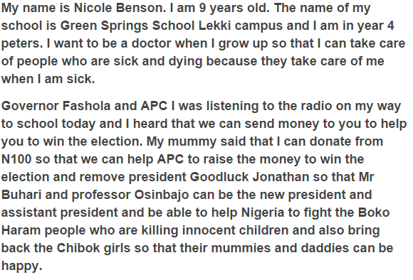 9yr old Nicole Eniiyi Benson yesterday March nineteenth gave N10k to the APC Presidential campaign group and freely read the letter she composed in front of an audience amid the Buhari interactive session with ladies in Lagos.