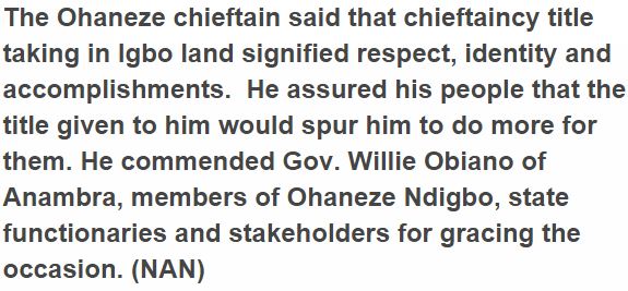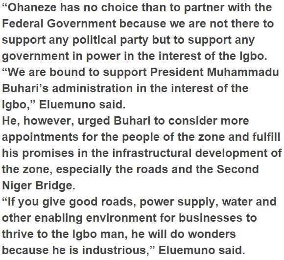 The Chairman of Ohaneze Ndigbo in Anambra, Chief Chris Eluemuno, has said that the association will undoubtedly support President Muhammadu Buhari in light of a legitimate interest for the Igbo. Eluemuno told newsmen on Sunday in the wake of being met with the traditional title of “Ogbuefi Nwajiugo” by his Nkwelle-Ezunaka group in Anambra that the apex socio-social association had no real option except to cooperate with the government.