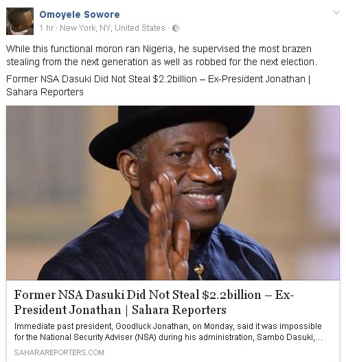 Omoyele Sowore reacted to Goodluck Jonathan’s statement that ”Dasuki did not steal $2.2 billion”.