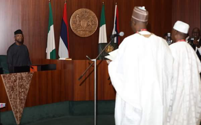 Acting President Yemi Osinbajo pictured swearing-in two new ministers Stephen Ocheni from Kogi State and Suleiman Hassan from Gombe State during the Federal Executive Council (FEC) Meeting at the Council Chamber State House, Abuja. Wed. 26 July 2017.