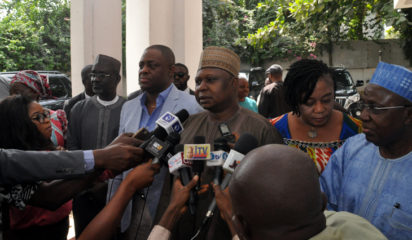 Jonathan meets ex PDP Ministers : From left, ex Minister of FCT Bala Mohammed, ex of Aviation Minister , Femi Fani- Kayode, ex Minister of Special Deities; Taminu Turaki, ex Minister of Information , Senator Patricia Naomi Akwashiki, President Goodluck Jonathan, King A .J Turner , ex Minister of Foreign Affairs Aminu Bashir Wali and ex Minister of Aviation; Mrs Fidelia Njeze in Abuja Office. Photo by Gbemiga Olamikan.