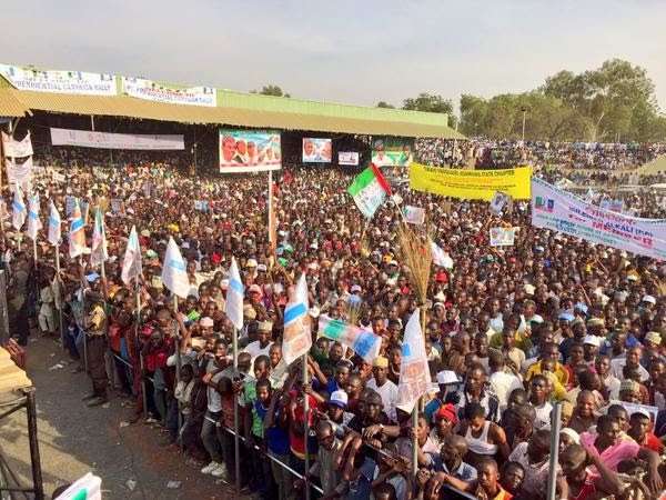 This time the APC rally is held in the capital of Adamawa State, Yola. As indicated by online networking, the swarm of supporters accumulated at the Mahmud Ribadu as Buhari was heading to the venue.