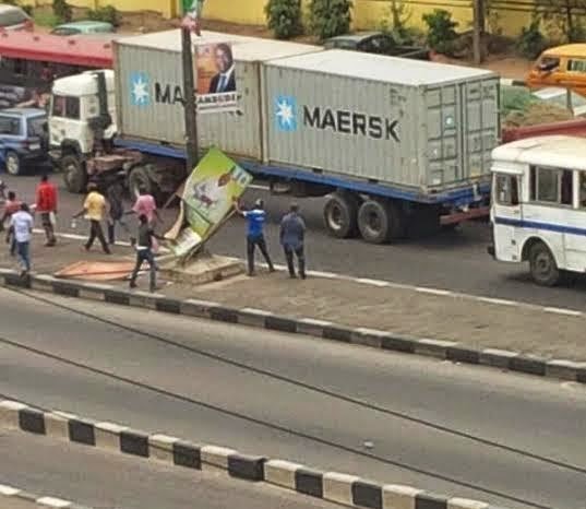 This happened this evening along Ikorodu street in Lagos. The hooligans were seen decimating APC Banners.