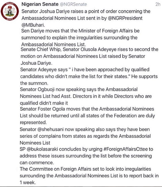 For lacking federal character, among other gross irregularities the Nigerian Senate has rejected President Buhari’s ambassadorial nominees list.