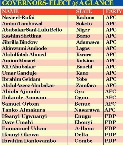 The APC won the governorship elections in Kaduna, Sokoto, Niger, Borno, Adamawa, Lagos, Kwara, Katsina, Bauchi, Kano, Yobe, Zamfara, Oyo, Ogun, Benue, Nasarawa, Jigawa and Benue States.