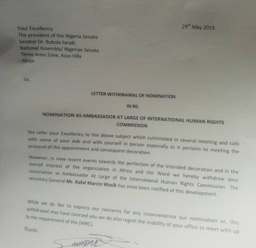 Part of the letter reads: “In view of recent event towards perfection of the intended decoration and the overall interest of the organization in Africa and the world, we hereby withdraw your nomination as Ambassador-at-large.”