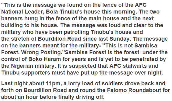 Haha. These legislators sha! It would appear that the APC is as yet demanding that FG is sending military men to watch the Lagos home of Asiwaju Bola Tinubu.