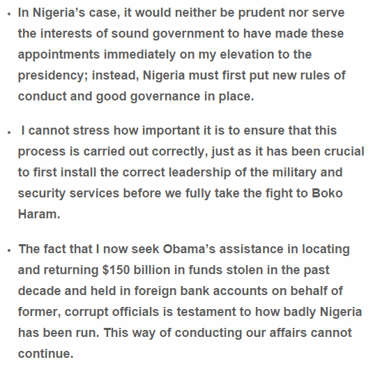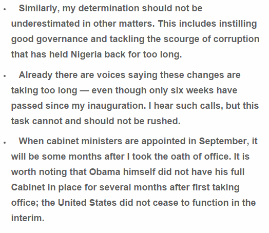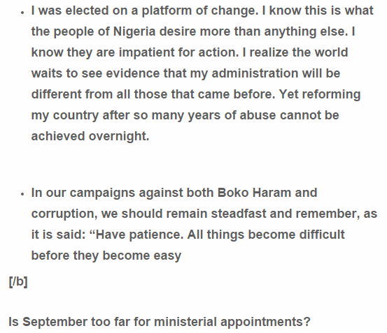 President Muhammadu Buhari, in an article distributed on Washington Post today, July 20, 2015, has clarified why he won’t name ministers into his cabinet until September 2015. Buhari additionally asked Nigerians to exercise patience with him as his organization sets the foundation for the change the nation so frantically needs.
