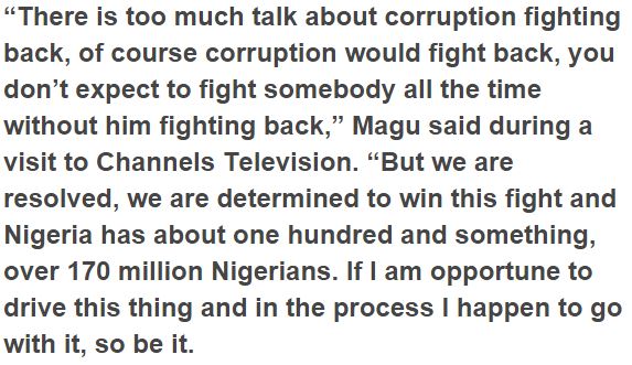 Magu,we trusted you and you have good intentions to Nigeria and Nigerians.We are praying for you and your success day and night,inshallah nothing will happen to you therefore,carry go definitely you will succeed.
