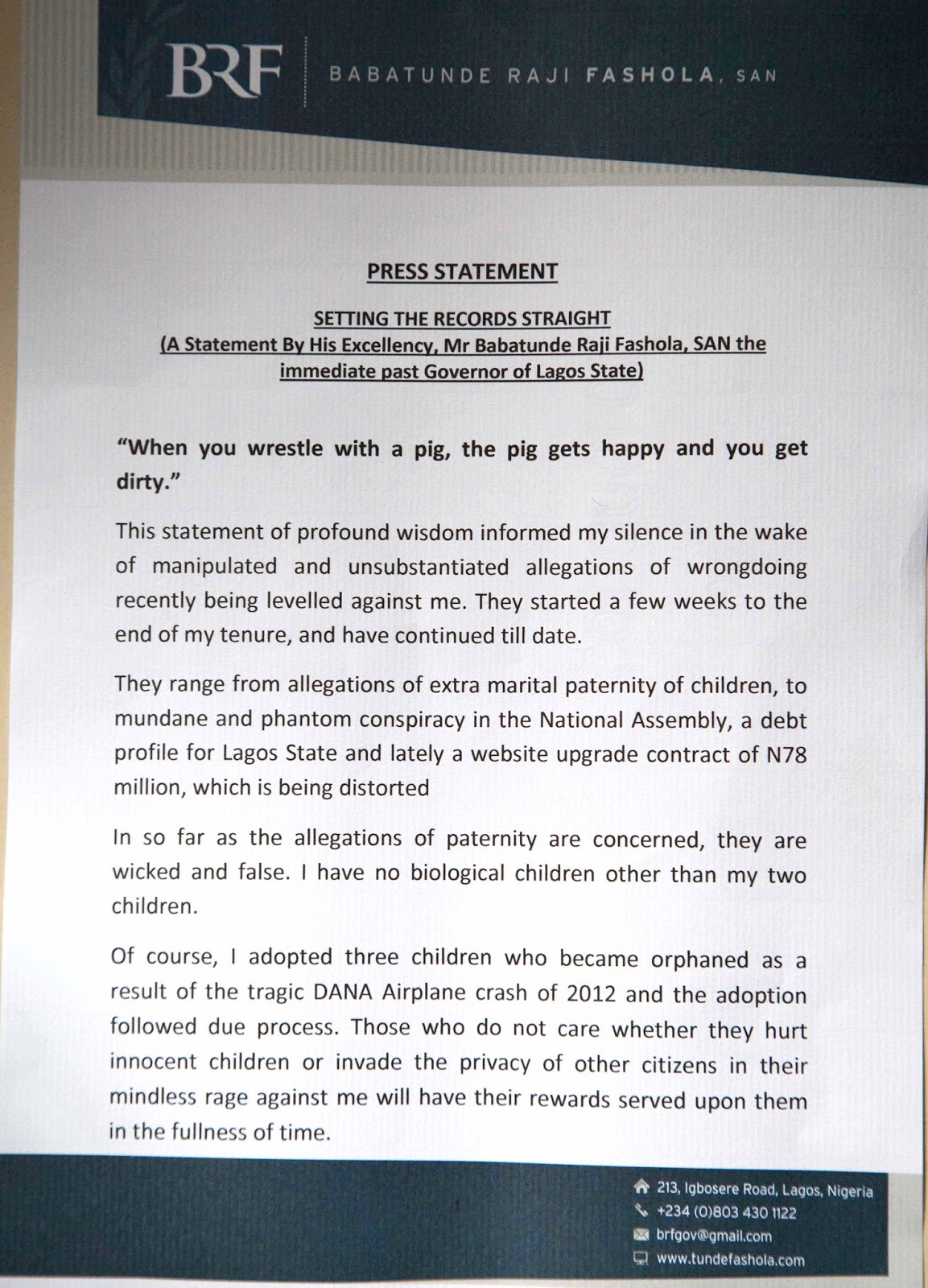 Official press statement by former Governor Raji Fashola on website allegations.