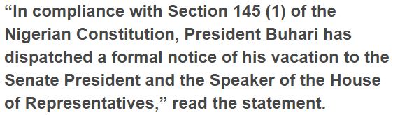 President Muhammadu Buhari has embacked on a 5-day vacation; from Friday February 5 to Wednesday February 10, 2016. A statement by Femi Adesina, special counsel on media and publicity to the president, said that Vice President, Yemi Osinbajo, will perform the functions of the president while Buhari’s trips last.