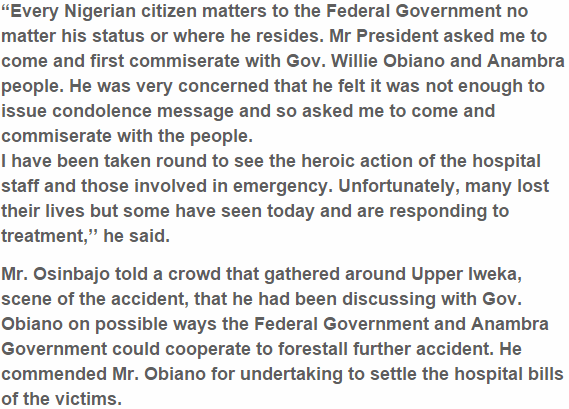VP Yemi Osinbajo on Wednesday sympathized with the individuals and legislature of Anambra over the fuel tanker accident, which took more than 40 lives at Upper Iweka in Onitsha.