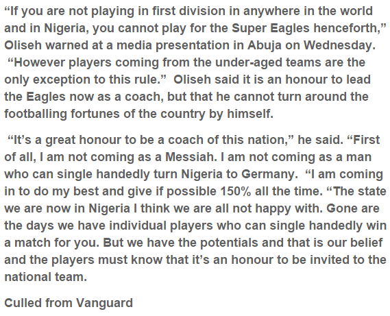 Coach Sunday Oliseh has fired a warning notice, expressing that he will only consider players who feature in top leagues both home and abroad. Stephen Keshi, however was known to call up players from the lower division abroad. Sunday Oliseh said he needs to roll out improvements and not do the same thing Stephen Keshi did. He said: