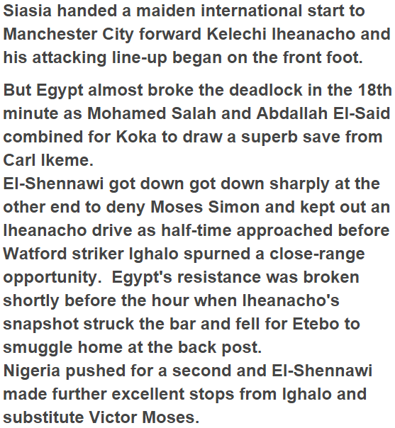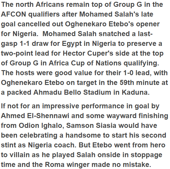Egypt’s star man Mohammed Salah paralyzed Samson Siasia’s men in Kaduna tonight in the wake of rallying late to score an additional goal that leaves the Super Eagles’ odds of qualifying for next year’s African Cup of Nations event in peril. Samson Siasia, Nigeria’s overseer mentor for the qualifiers after Sunday Oliseh’s stun resignation began the match with Odion Ighalo , Ahmed Musa and Kelechi Iheanacho gazing in a three-pronged attack for the host group.