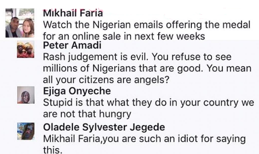 Nigerians mad at a New Zealander who mocked Nigerians after winning bronze at the Olympics.