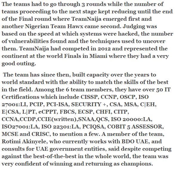 A Nigerian Team of cyber security experts “TeamNaija” will be speaking to the African landmass at Washington, DC in this year’s Cyberlympics occasion. The group is comprised of Wale Obadare (Digital Encode), Uchenna Aka (FirstBank), David Abolusoro (FirstBank), Rotimi Akinyele (BDO UAE), Bimbo Jaiyeola (Union bank) and the group chief Oluseyi Akindeinde (Digital Encode).